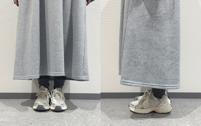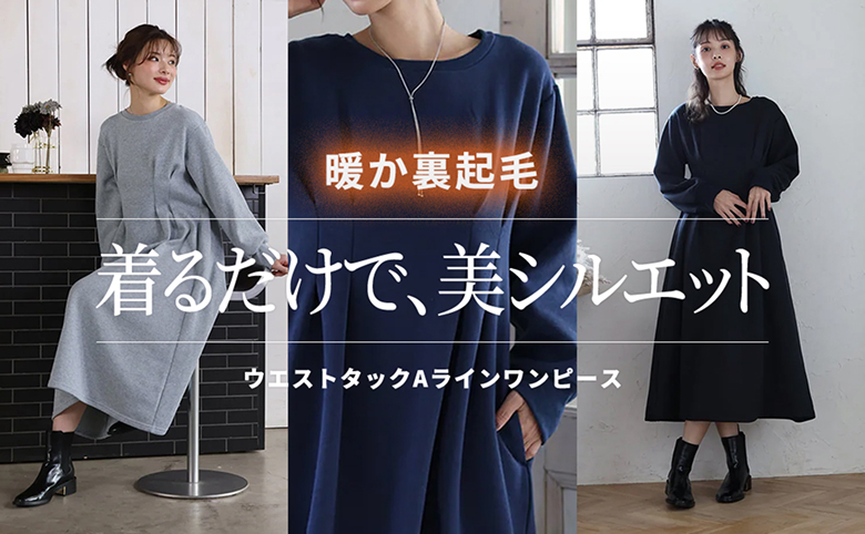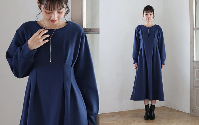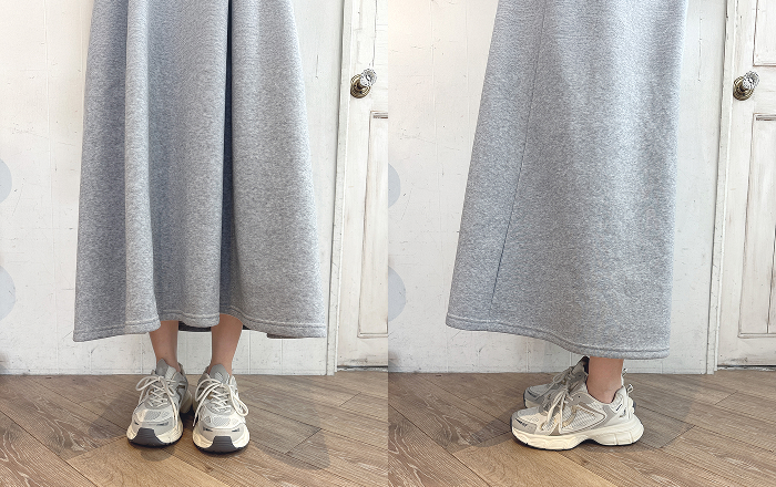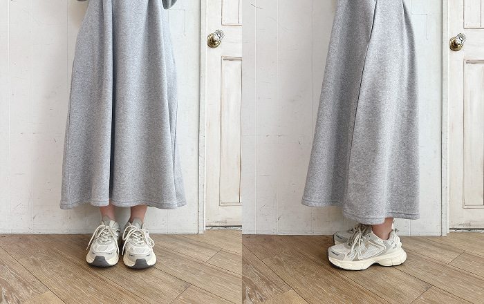 細見えシルエット - スウェット素材でありながら、カジュアルすぎない上品さの秘訣は、ウエストのタックデザインにあります。ウエストタックにより、ウエスト位置を高く見せ、そこから裾に向かって広がるAラインシルエットを作り出しました。気になる体型をカバーしながら、スタイルアップを叶えます。