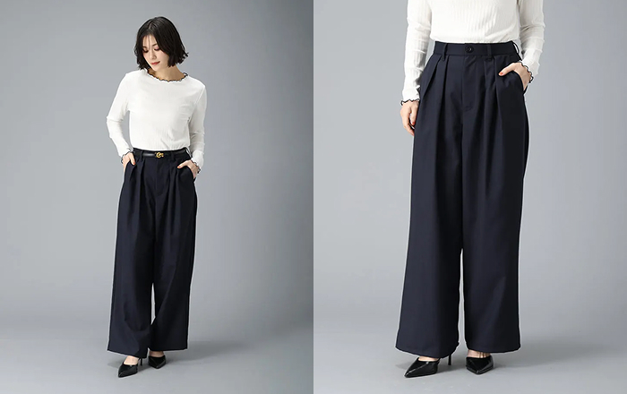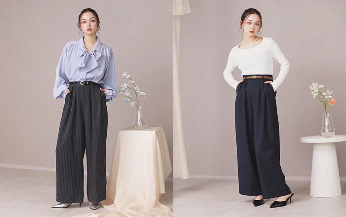 ストライプパンツで甘さを引き締めれば、甘辛バランスが絶妙な仕上がりに。あえてシンプルにまとめれば、ワイドパンツの質の良さが引き立ちます。