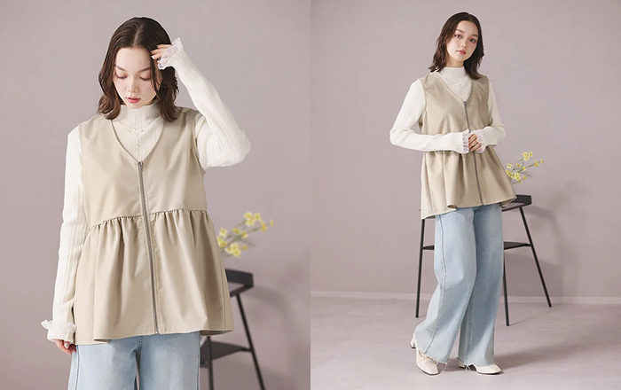 デニムやワイドパンツと合わせて、甘さを抑えた大人カジュアルに。