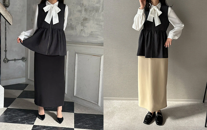 ジャケットやツイードトップスと合わせれば、オケージョンにも対応。上下セットで着こなせば、テクニック不要で品格のあるセレモニースタイルが出来上がります。