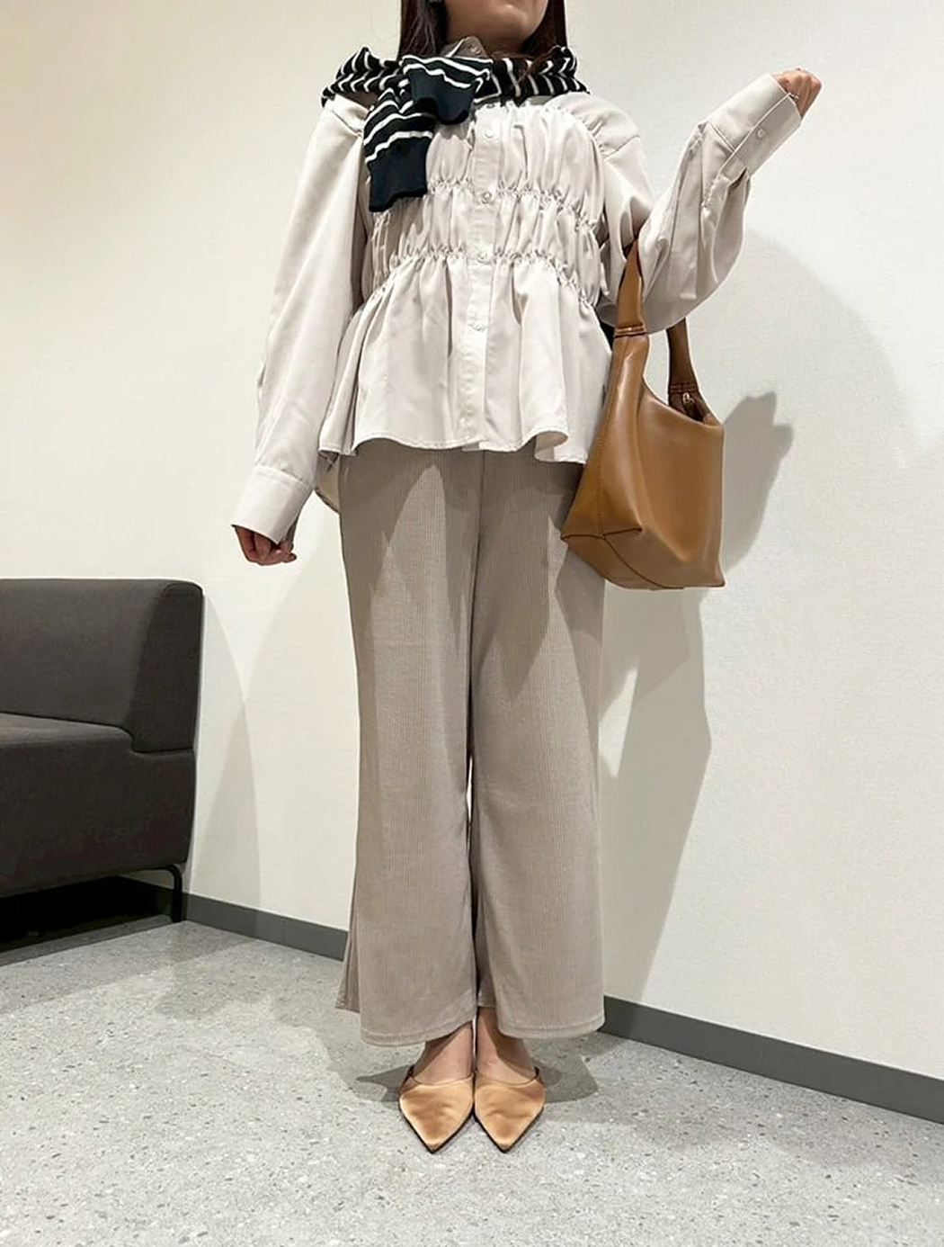 着こなしポイントリラックス素材のリブパンツには、シャツやデザインニットなどの、異素材を意識してトップスを選ぶと失敗しにくいです◎また、ジャケットなどキレイめアイテムを合わせるとカジュアル感が抑えられて失敗しにくい!