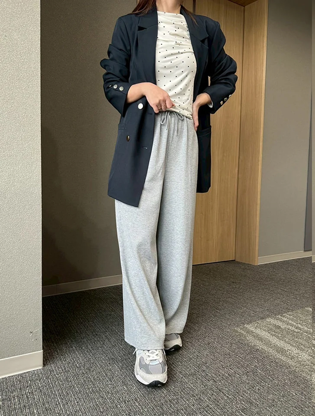 「異素材と上品ミックス」を意識リブパンツの最大の魅力は、ノーストレスなリラックス感です。しかし、合わせるアイテムを間違えると、せっかくのオシャレも部屋着感が出てしまいます。洗練された大人カジュアルに格上げするカギは、「異素材」と「上品さ」の意識的なミックスがおすすめ。
